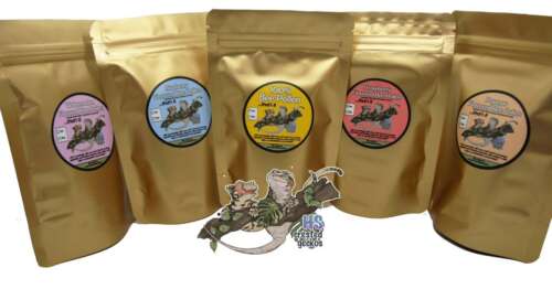 From there, it moved into other types of products. I wanted to make something that was unique that no one had ever done before, that was something people could use (and admittingly, come back to purchase more than once) and I had a brain blast one day of adding flavors to Bee Pollen to add variety to gecko diet without changing the diet entirely. It would add the flavor and nutrient benefits of not just the bee pollen, but whatever fruit I decided to add. After doing research into what fruits would be best for reptiles and other small animals, I decided on my initial four flavors. I ran a test trial for a couple months to get feedback on fruit to bee pollen ratios, and landed on a mix that wasn’t too overpowering. I mix the bee pollen with the 100% freeze-dried fruit powders in-house, and take many safety precautions when doing so to ensure the packages and surrounding areas are sanitized and the product will last a long time once packaged. A little over a year after the initial flavors were announced and started to sell, I introduced four new flavors (the “seasonal pack”) and initially released them one-by-one lined up with the current seasons on that year. They are all currently available for purchase, and although I have a small collection of pre-made packages for use to bring to reptile expos, the majority of my bee pollen is made-to-order now to ensure it’s freshness, longevity, and quality.